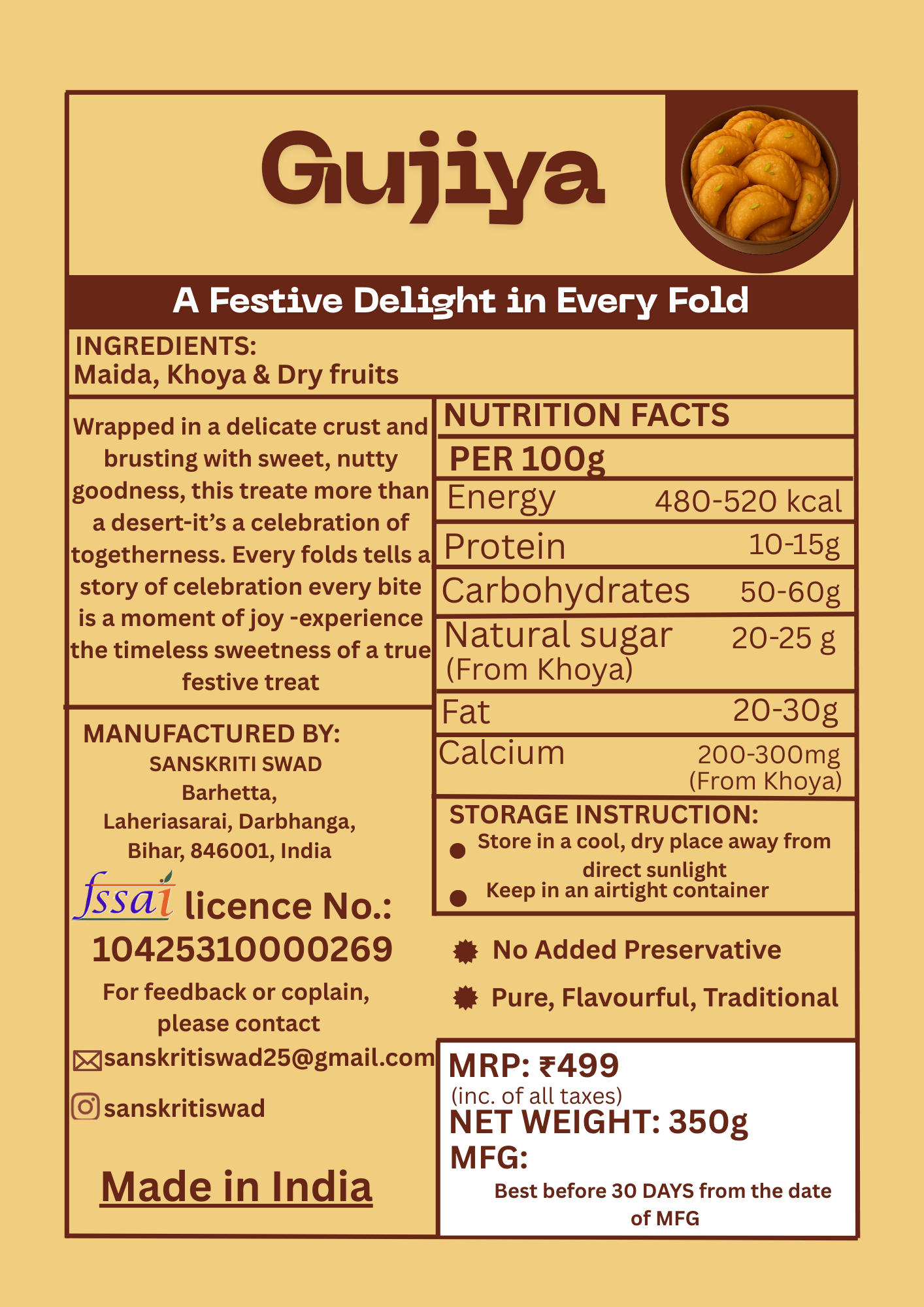 Experience the timeless taste of tradition with our handcrafted Gujiya, a beloved Indian sweet that brings joy to every occasion. Each Gujiya is made with care, featuring a delicate, golden-brown outer shell that is perfectly flaky. Inside, you’ll find a rich and indulgent filling made from fresh khoya (milk solids), creating a balanced sweetness that delights the senses.
